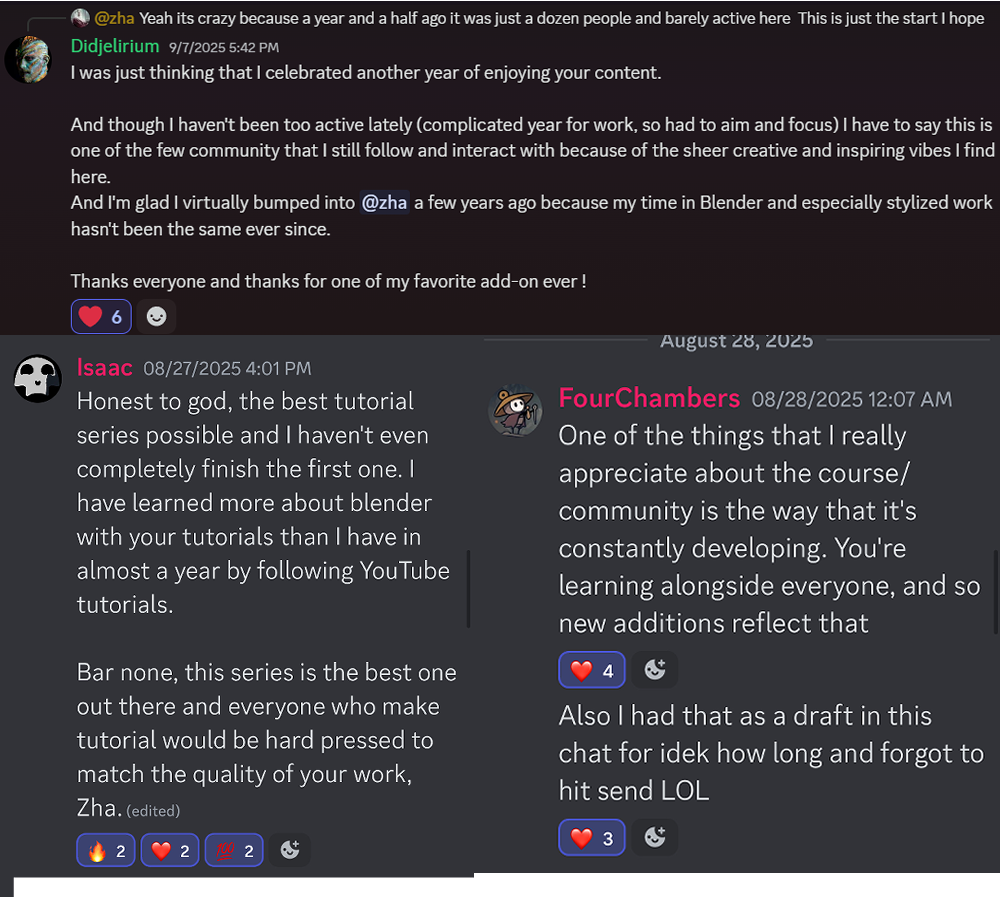 Over the past 7 years, I have spent countless hours creating art with Blender.Testing different strategies, trying different methods, and working on all sorts of different projects.One day, I set out to create a class containing multiple courses that I wish I had when I first started using Blender and creating stylized art -- to save people countless hours,and pave the way for new Blender artists to pick up a strong foundation quickly.That became this masterclass here on your page right now.This is not just a regular class: new courses have been added over time, which are kept up to date.Not only that, but it includes a vibrant and active community, with members ranging from total beginners to industry professionals.